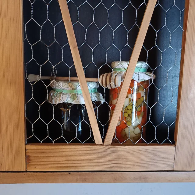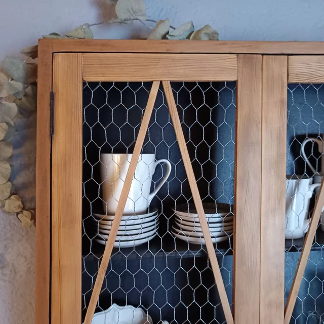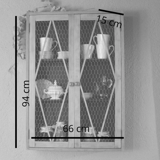 Alacena de madera y malla de gallinero con 3 estantes. Pintada por dentro con pintura al agua para mayor higiene y protección. Madera protegida con cera incolora. Con gran capacidad de almacenaje pero escasa profundidad, ideal para espacios pequeños o estrechos. A punto para su uso en hogar o establecimiento comercial.