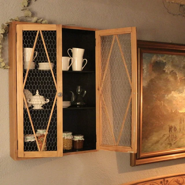 Alacena de madera y malla de gallinero con 3 estantes. Pintada por dentro con pintura al agua para mayor higiene y protección. Madera protegida con cera incolora. Con gran capacidad de almacenaje pero escasa profundidad, ideal para espacios pequeños o estrechos. A punto para su uso en hogar o establecimiento comercial.