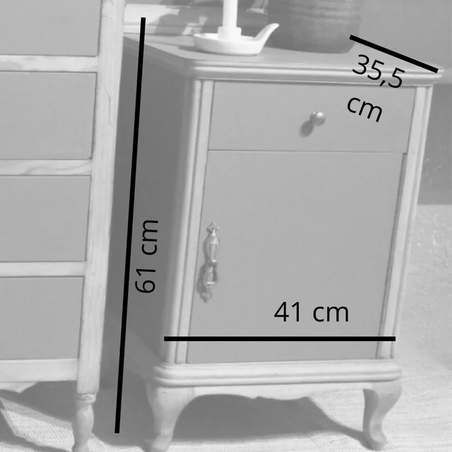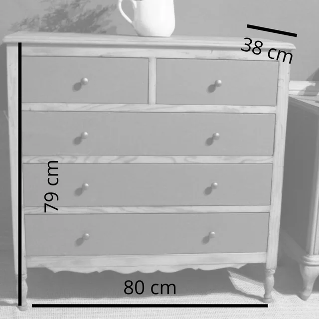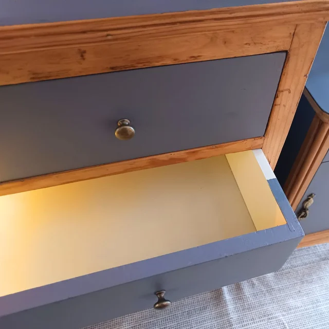 Conjunto de cómoda y mesilla de noche de madera con acabado en gris y detalles en madera natural. Incluye una cómoda de 5 cajones y una mesilla de noche con cajón y espacio de almacenaje. El interior de todos los cajones se ha pintado con pintura al agua para mayor higiene y protección. A punto para su uso. Se pueden vender por separado (cómoda 170€ y mesilla 125€).