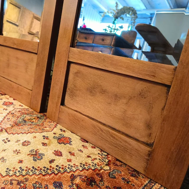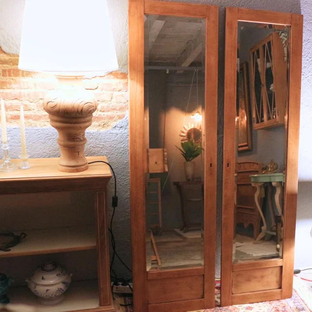 Espejo alto biselado con marco de madera maciza. Acabado en cera incolora respetando la pátina original de la pieza antigua. Restaurado y a punto para su uso en vivienda o establecimiento comercial.