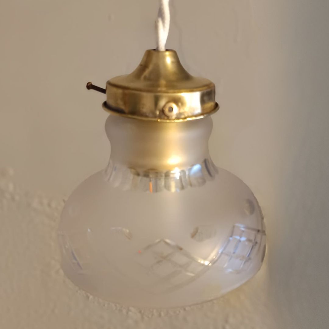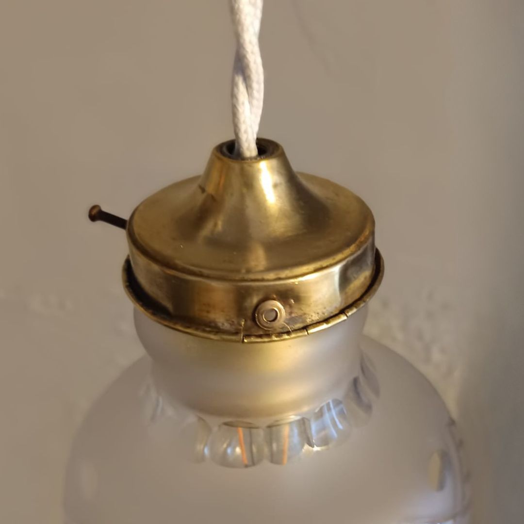 Lamparita de techo de vidrio y latón estilo victoriano. Todo el mecanismo eléctrico es nuevo y las piezas ornamentales son antiguas. Dispone de 5 metros de cable eléctrico trenzado nuevo que evoca los antiguos cables de las casas de finales del s.XIX. Al final del cable se incluye clavija nueva para ir enchufada en la pared. En el precio también incluimos la bombilla decorativa de luz cálida. El diámetro de la tulipa es de 13cm. A punto para colgarla en tu casa o comercio.
