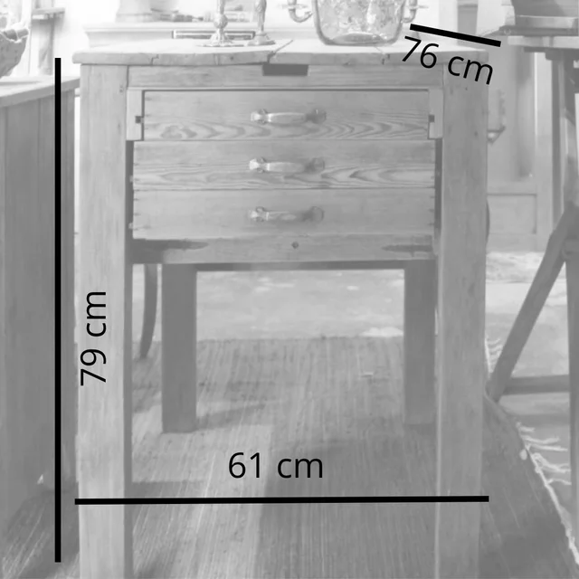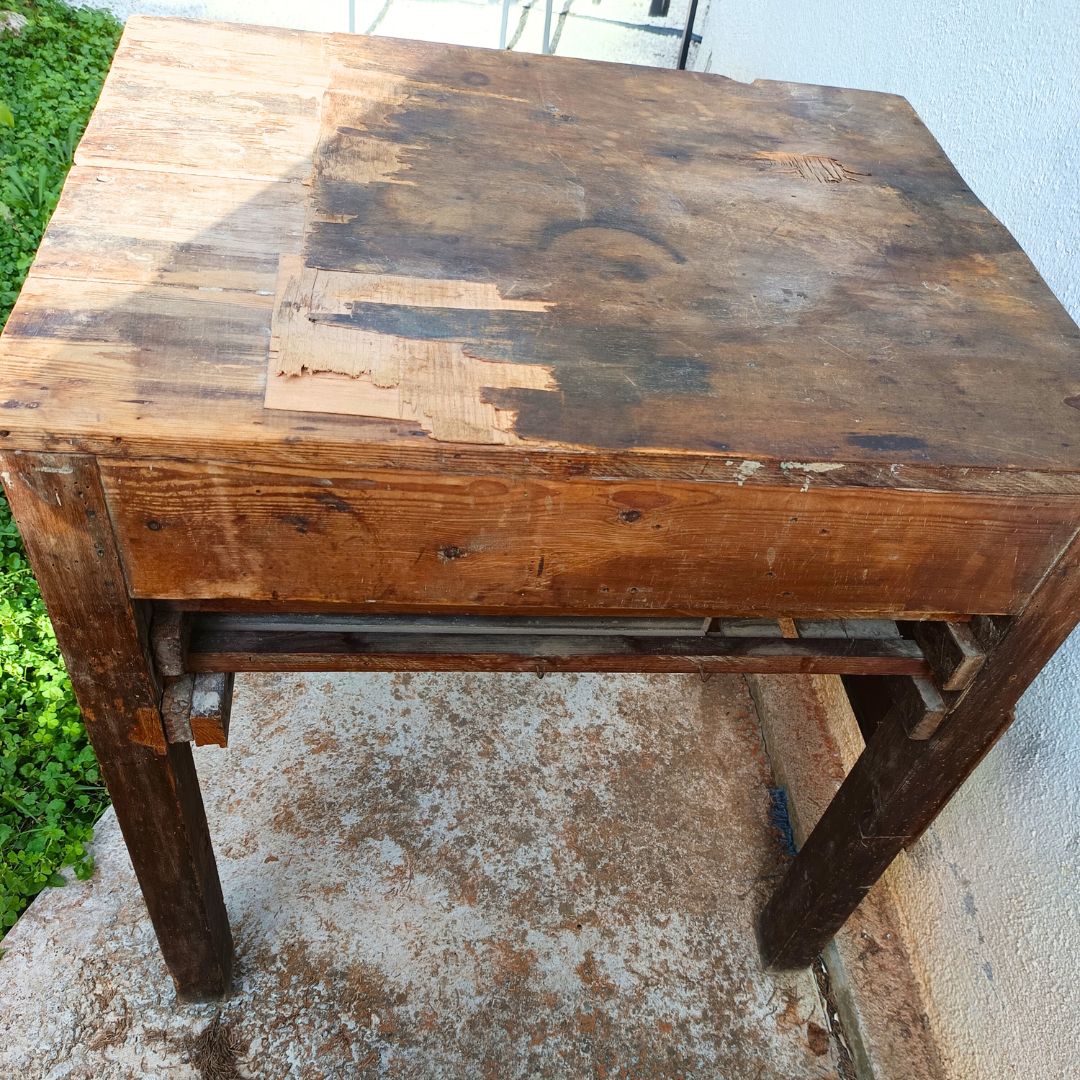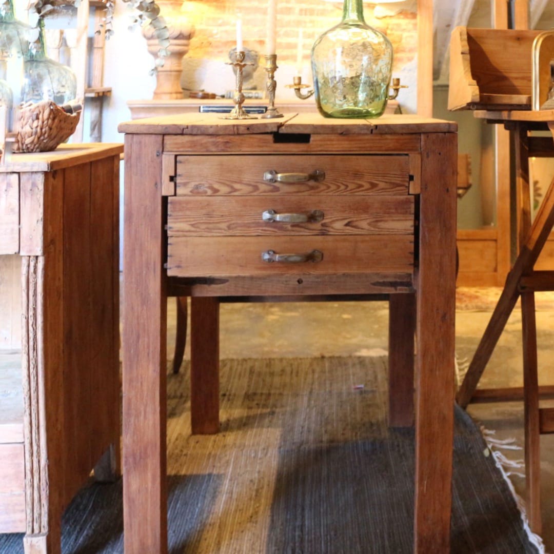 Esta mesa tocinera procede de un colmado de Barcelona fundado alrededor de 1920 llamado “La Central” en el que aún se vendía todo a granel: chocolates, turrones, encurtidos, especias, legumbres…El establecimiento, que actualmente es una tienda de ropa, se encontraba en la Calle Sant Pere més Baix, cercano al Mercat de Santa Caterina, en plena Ciutat Vella. La familia que regentaba el negocio lo usaba como mostrador para dispensar aceite a granel: bajo el tablero se disponía el bidón del cual se sustraía el aceite desde arriba con una manivela manual que accionaba una bomba y un pequeño grifo para llenar los recipientes de los clientes. Los cajones son de 1970, año en que el nieto de Antoni, dueño del colmado, le encargó a un carpintero poner tres cajones y un tablero nuevo de chapa (para tapar los orificios que había dejado el dispensador de aceite) y se lo quedó en su propio negocio para darle otro uso. Cada paso en la recuperación de esta joya del pasado ha sido muy meditado: ha habido que sanearla a fondo, devolverla a su estado original y, además, hacer de ella un mueble funcional, una tarea compleja dado que, intencionadamente, se han puesto en valor todas las huellas de su pasado y de aquello para lo que fue fabricada. Ojalá la disfrutéis tanto como nosotras en su restauración.