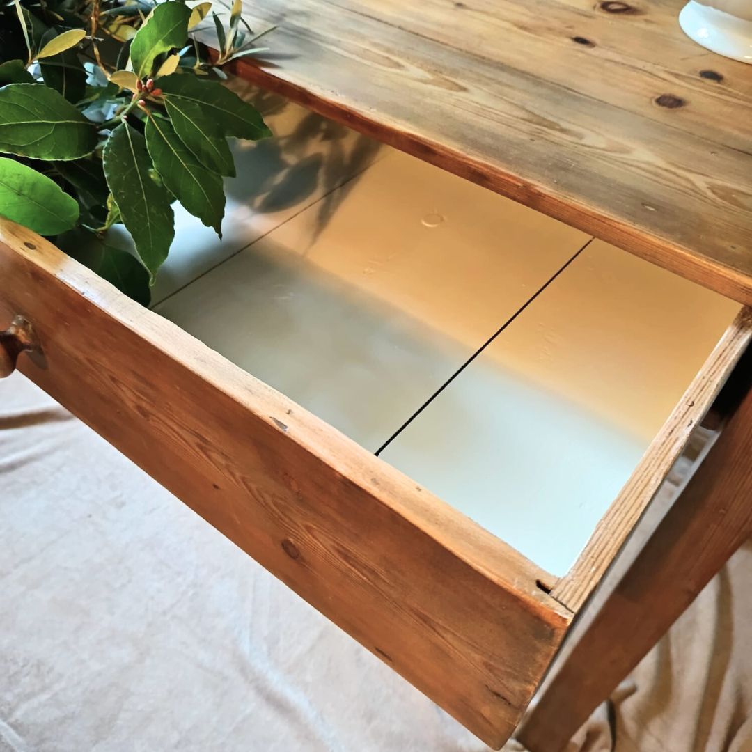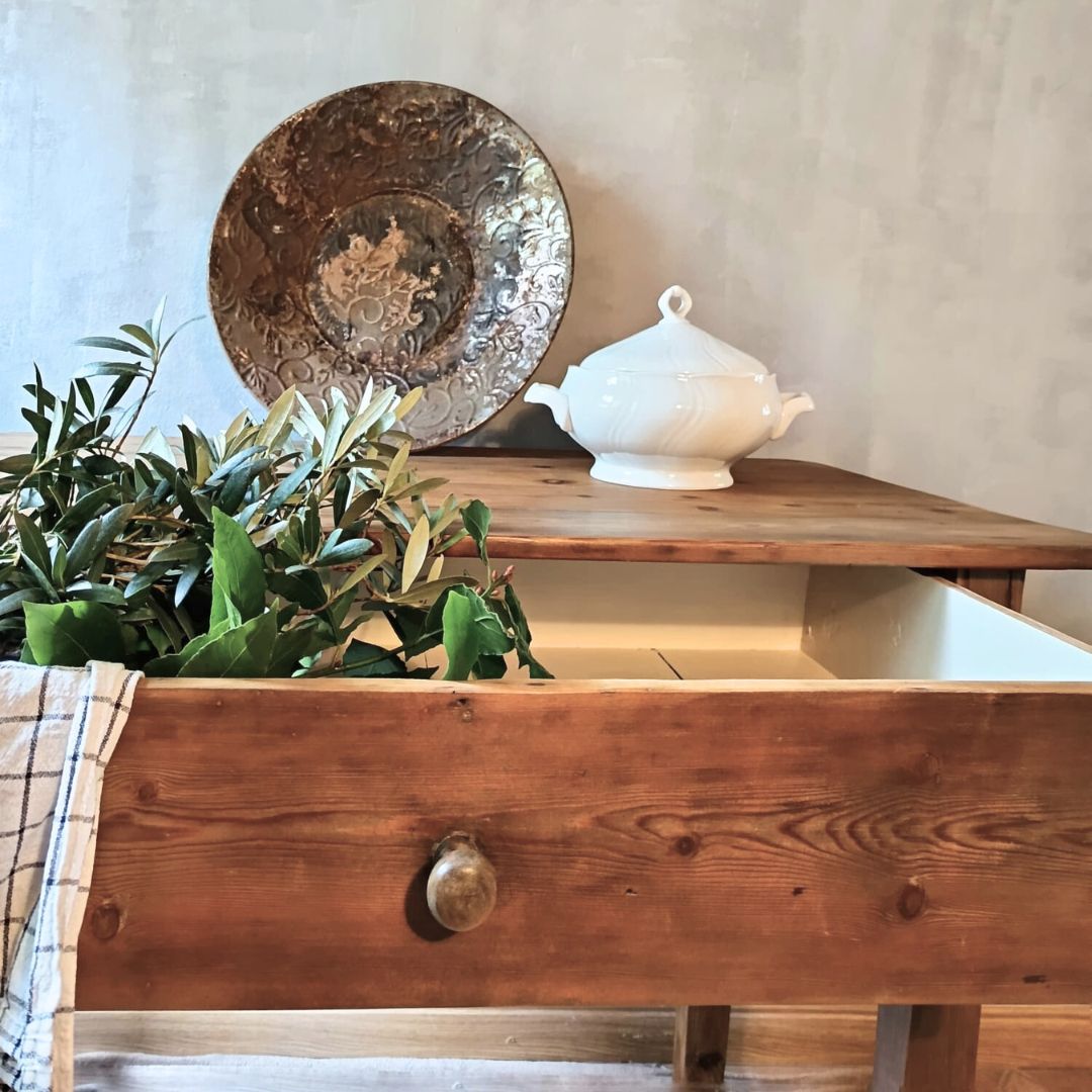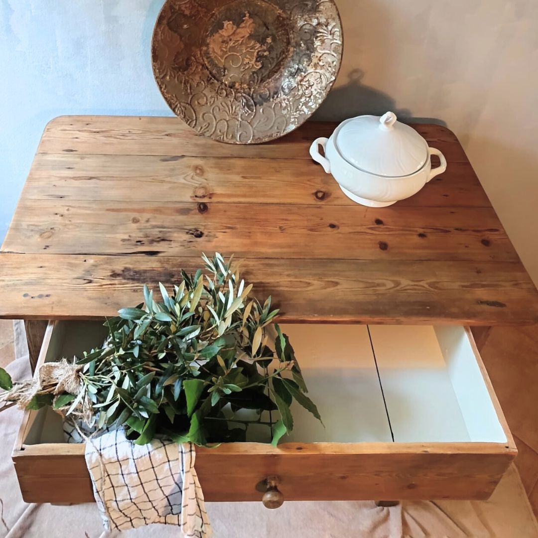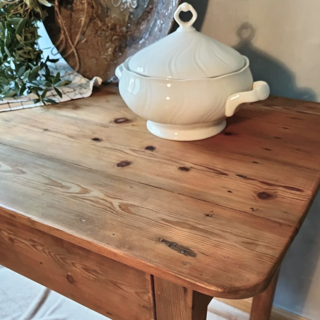 Mesa tocinera de madera maciza muy antigua recién restaurada. Está completamente saneada y tratada, a punto para su uso en vivienda o establecimiento comercial. Dispone de un cajón con mucha capacidad. El interior del cajón se ha pintado con pintura al agua en un tono neutro para mayor higiene y protección. Se han reforzado las 4 patas. Una de ellas, además, se ha reparado quedando una mesa estable y robusta para cualquier uso.